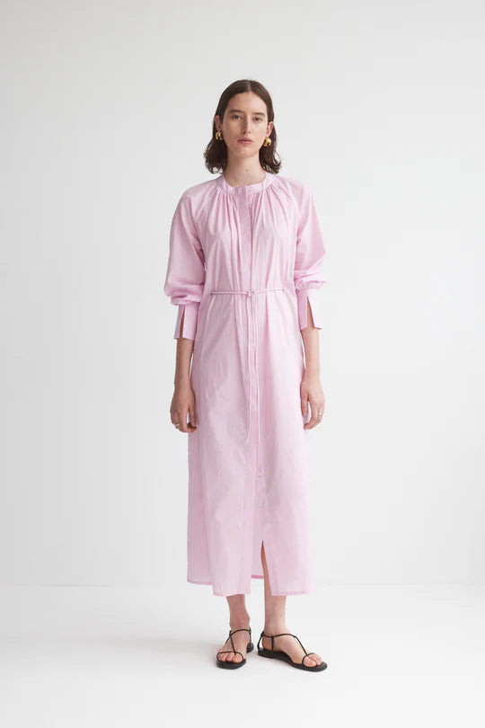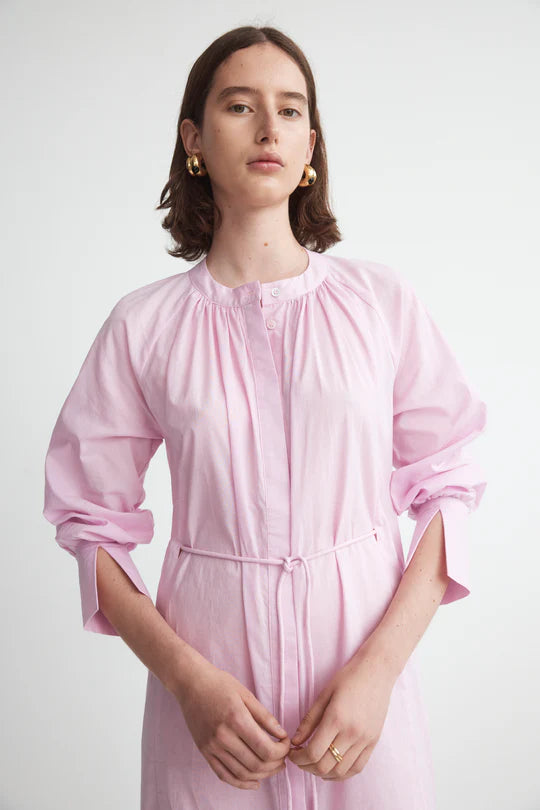 Honor Foemina's gender-fluid style with the Agnes dress in cotton voile. The grandpa collar, hidden placket, and cinching belt add subtle volume, while the draped long sleeves and peeking cuffs bring a sophisticated touch.