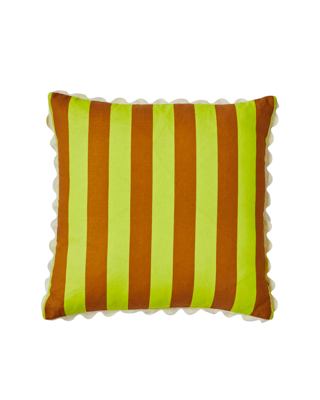 This lively lime green linen cushion features Bonnie and Neil's Bold Stripe pattern, bursting with retro cheer and a garden-fresh burst of energy. A striking stripe that adds instant fun and flair.