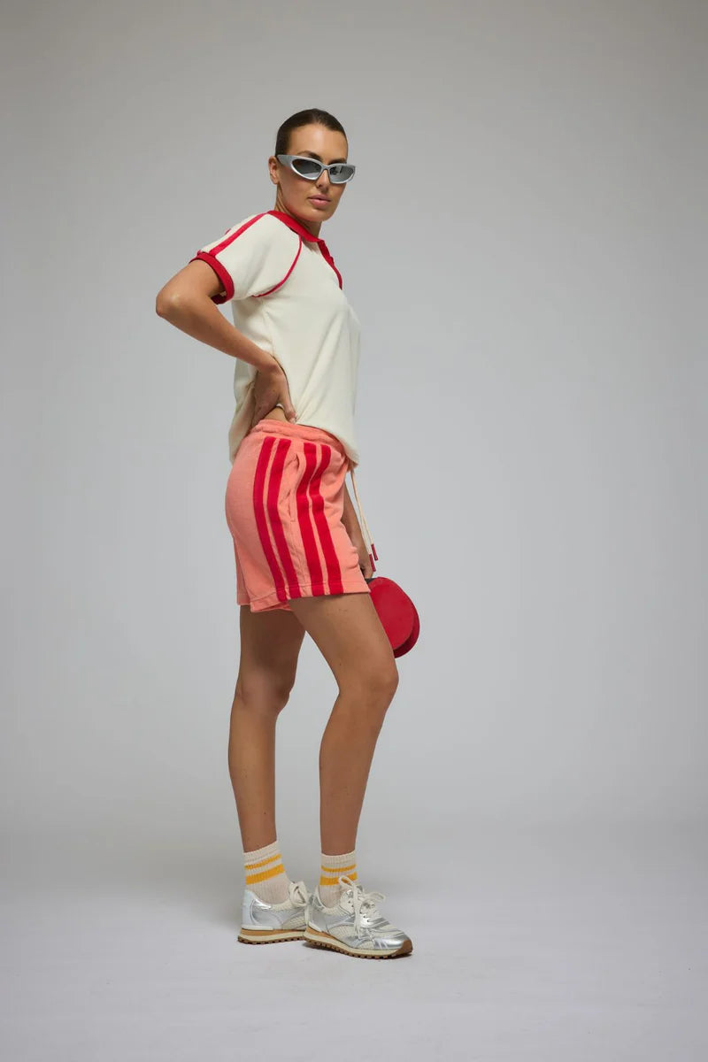 The Corfu Terry Short in Bougainvillea Pink from Araminta James in the perfect laid back weekender short! Perfect for those relaxed spring days ahead these shorts deliver vacation-worthy comfort for every day. Made from 100% premium cotton terry towelling with velour side panels in a striking red, they offer both softness and flair. An elastic waistband keeps things comfy and side pockets to keep you hands free.