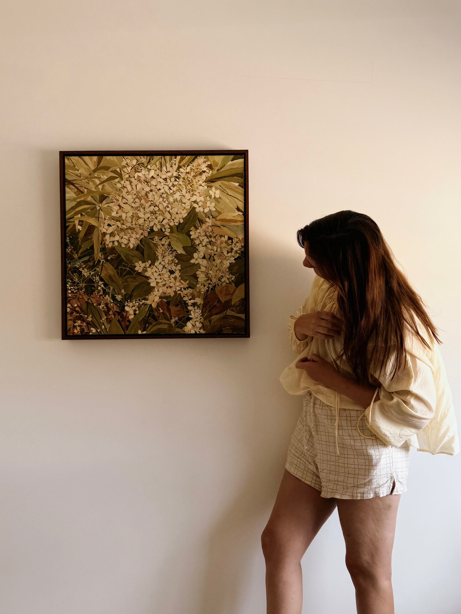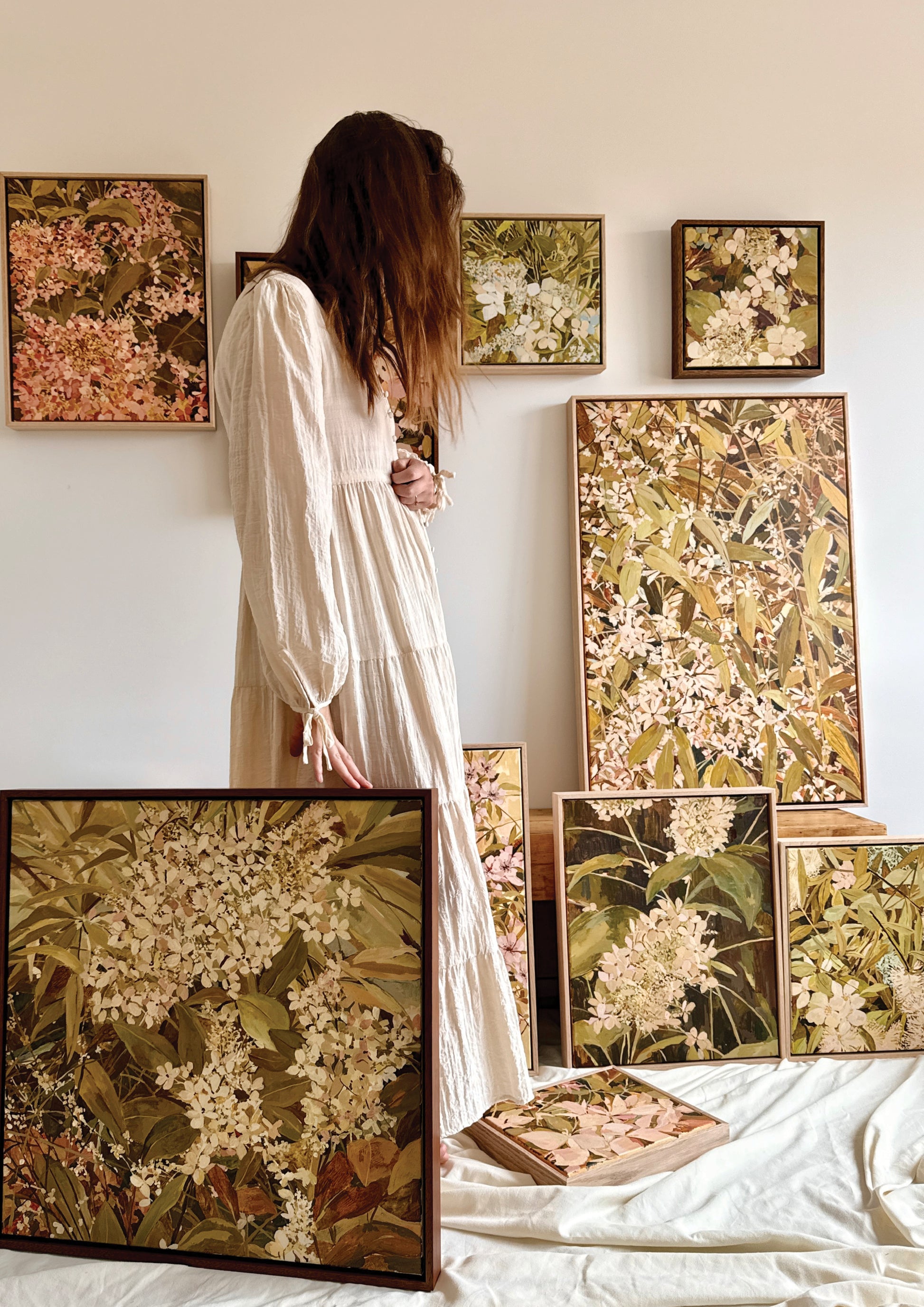 A Note From The Artist: "Welcome to my first full collection of art. Previously my practise has been somewhat sporadic and free flowing. I didn't Plan this series out, I just painted as I felt, exploring colourways and floral subjects in a way that felt right. I wanted to create a collection of pieces that exuded warmth and abundance, like an Australian Cottage Garden. 'Flower Gaze' became a celebration of small moments, like tangled blooms that deserve to be observed and cherished. I spent my days painting in between mothering, there is love in each of these works. I hope these pieces give you pause, time to stop and be present. Anna"