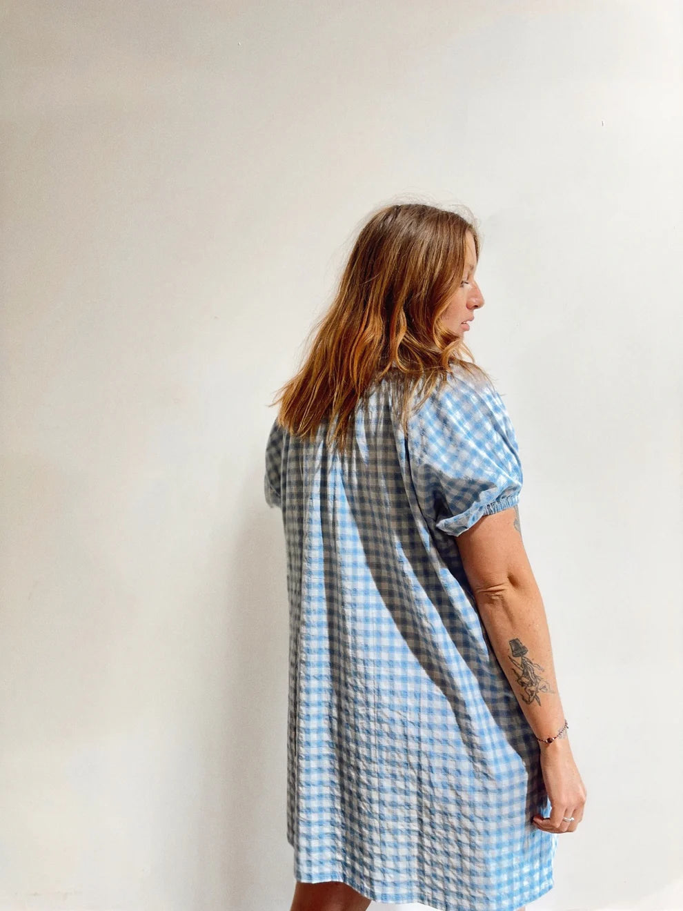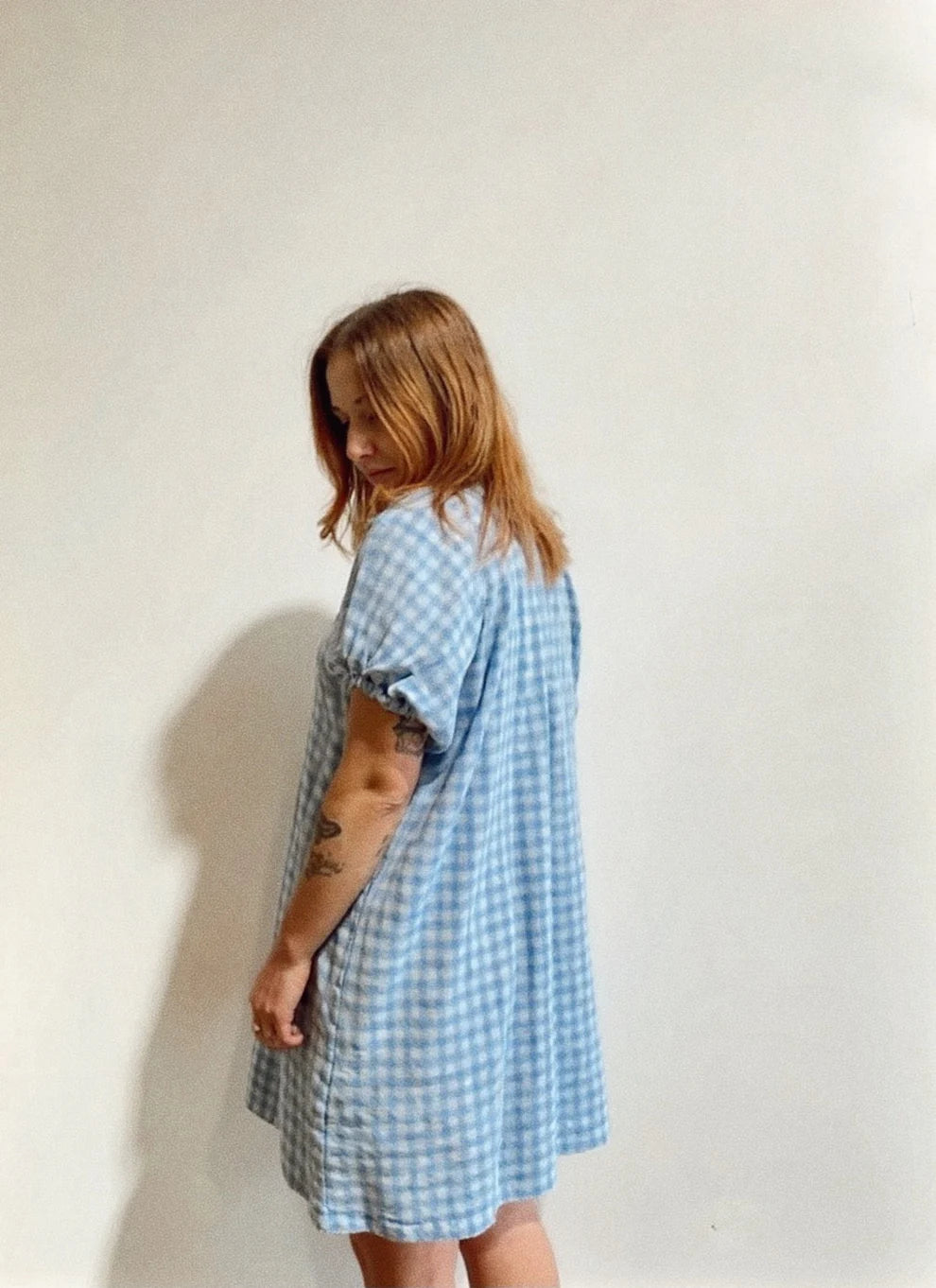 Relaxed fit perfect for warm days when you want to look cute but have no brain space for choosing a top AND a bottom, some days are not made for those kinds of complex problems. This cotton easy going frock is lightweight without being see through (horrah for whatever undies are sitting at the top of the pile!), it also has a little extra length at the back making it perfect for running after little humans. The puff sleeves, tie front and dusty blue gingham give style in the most laid back way possible.