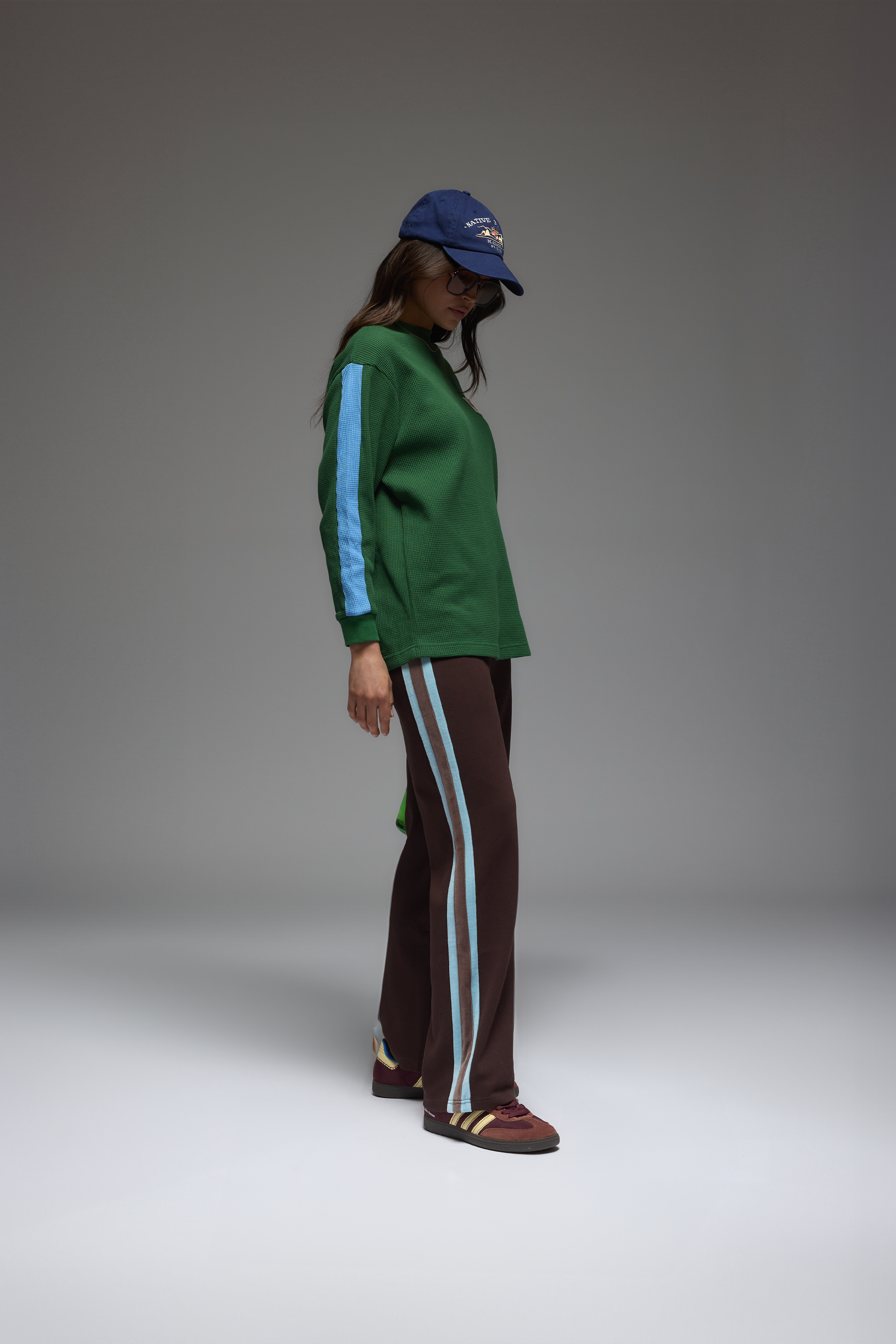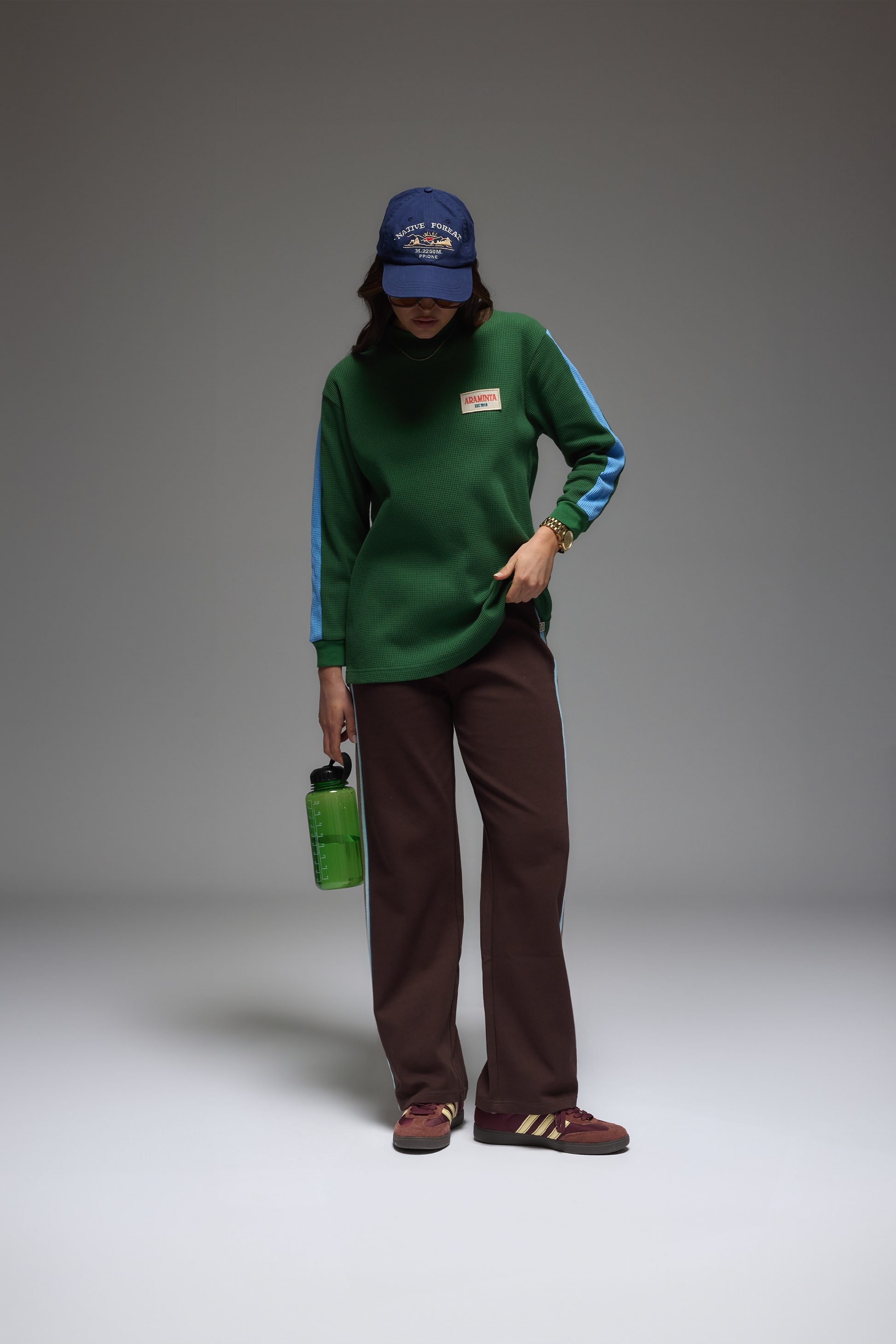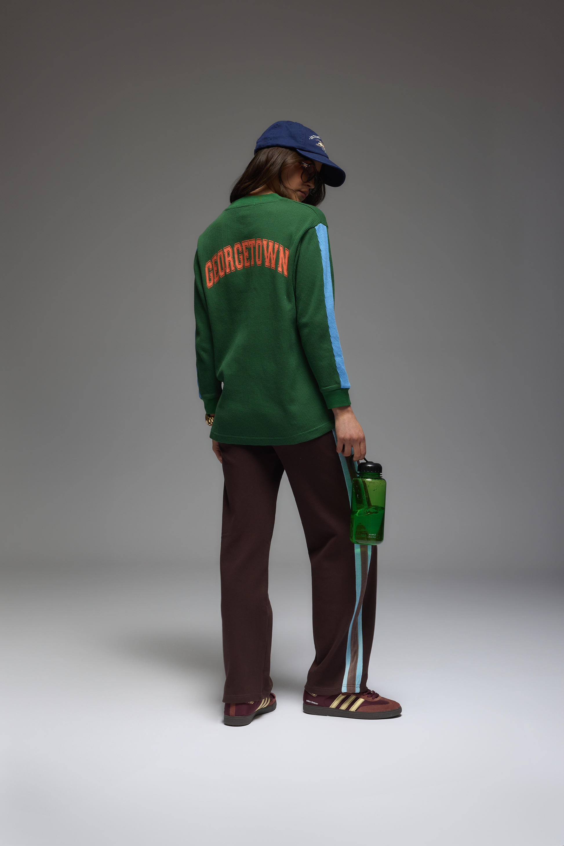 Meet the GT Long Sleeve Waffle Top in Forrest from Araminta James, boasting a cozy round neckline and playful French Blue trims on the sleeves. Crafted from soft cotton waffle fabric, it’s your go-to for laid-back style with a twist. Showcasing a fun embroidered patch upfront and a bold graphic on the back, this top pairs perfectly with our Cloe Knit Pant in Espresso for an effortlessly sporty and chic lounge vibe.