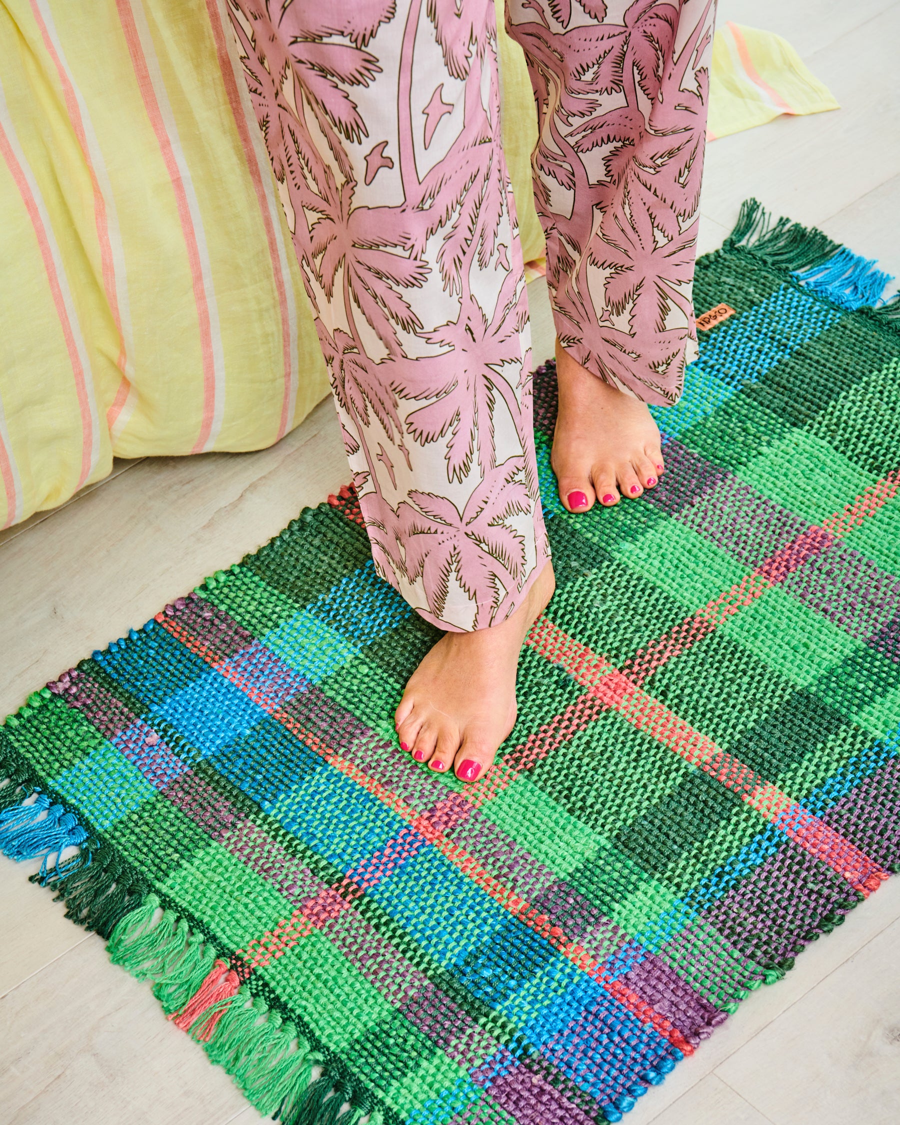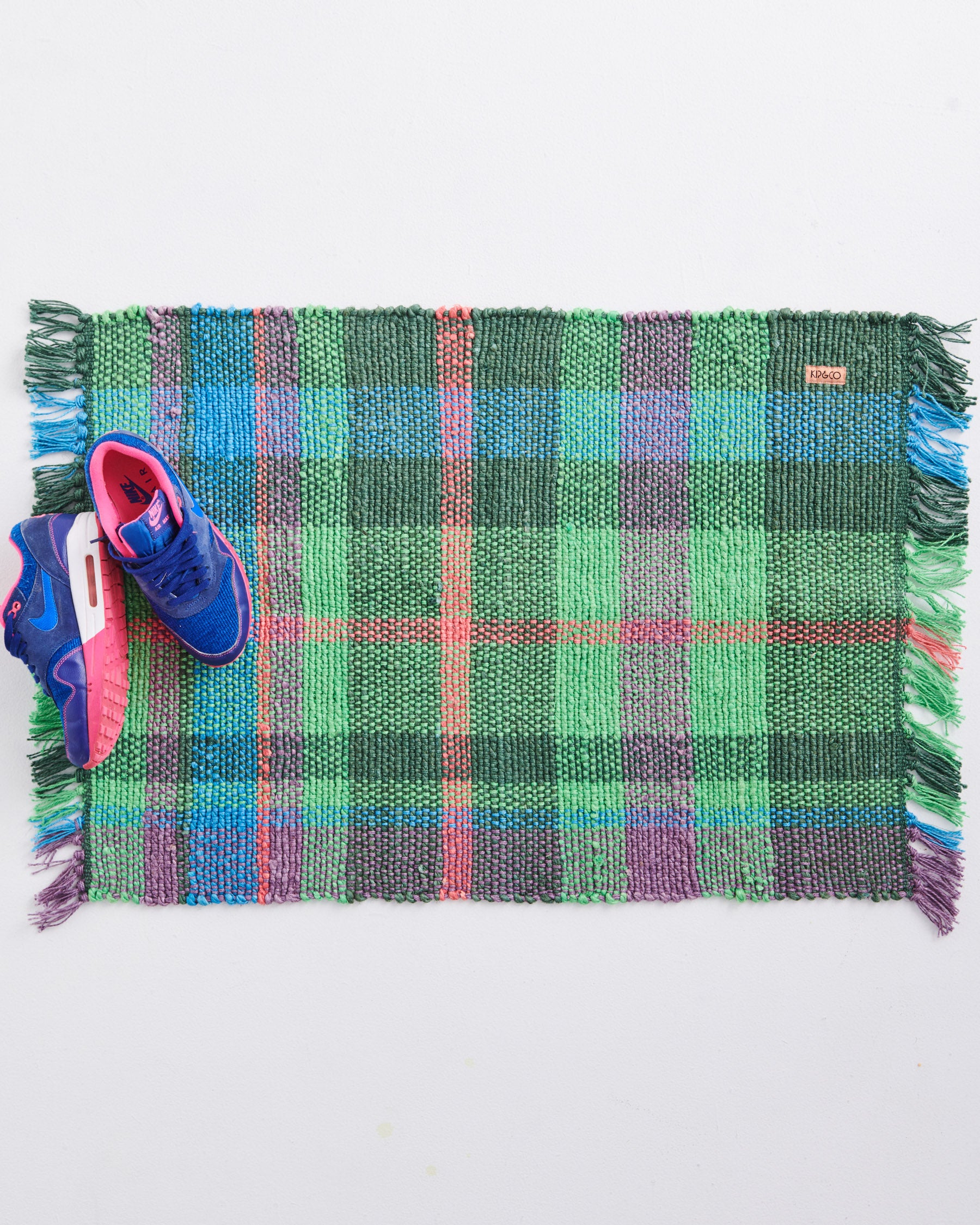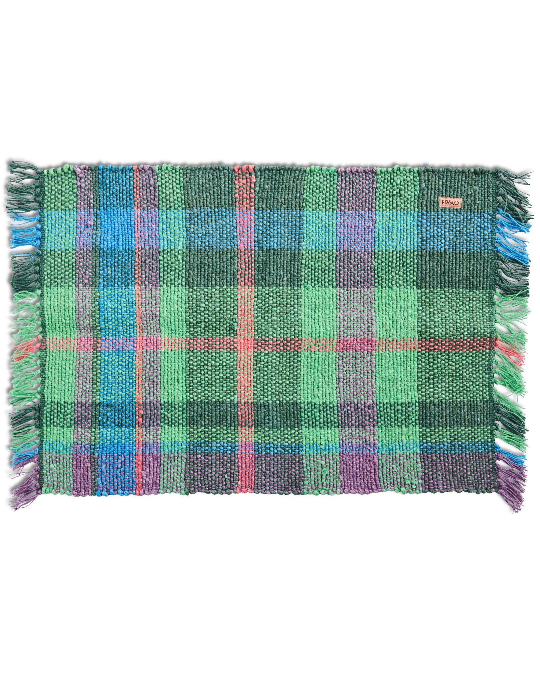 Infuse your home with colour in every corner! The Jewel Of The Nile Tartan Jute Floor Mat is crafted from natural woven jute and features a classic Kip & Co tartan pattern, refreshed for the summer ahead with vibrant jewel green tones alongside a mix of blue, pink, and purple, complete with knotted fringe edging.