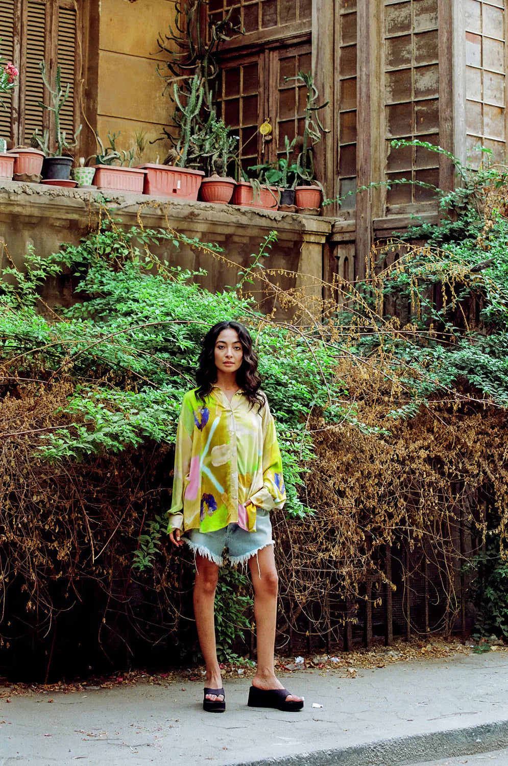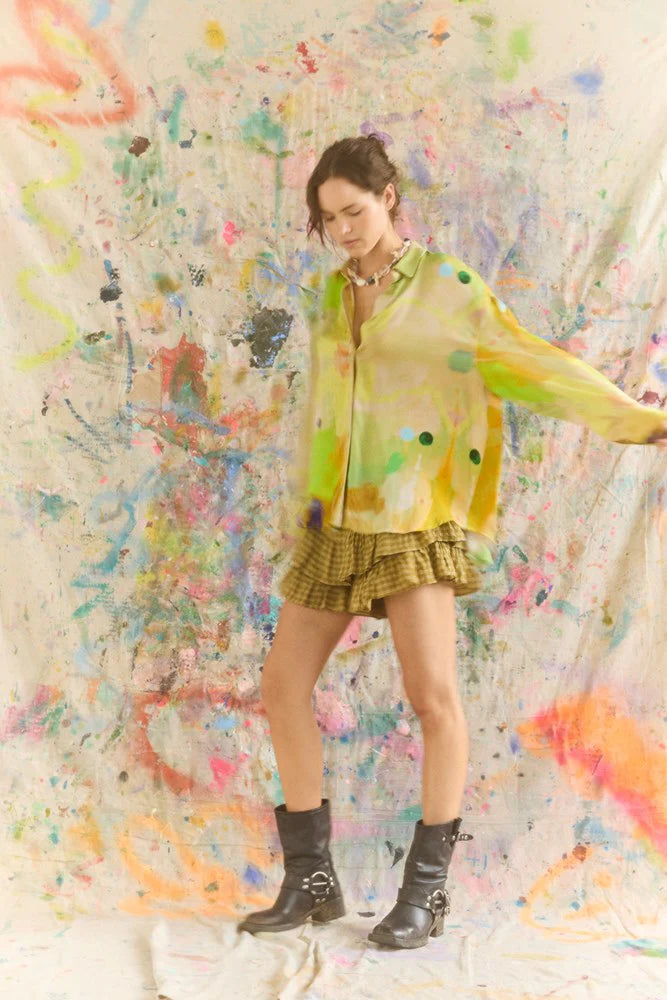 A collaboration that transforms Kate Eliza's vibrant vision into wearable art. This shirt celebrates spontaneous creativity through luminous brushstrokes rendered in soft viscose, dancing across a palette of citrus, blush, and violet. Each piece captures the energy and movement of the original artwork, bringing playful colour and joyful expression to your everyday wardrobe.