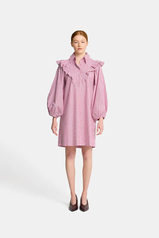 The Katia Mini Dress in Stripe is your go-to for effortless style with a twist. This crisp cotton poplin shift dress combines timeless tailoring with playful modern details that make it anything but ordinary. Gathered ruffles at the shoulders add movement and personality, while neon topstitching and cross-stitch buttons bring unexpected flair. A classic shirt collar keeps things polished, and full-length sleeves with elasticated cuffs offer comfort and soft volume. The yarn-dyed cotton delivers that cool, crisp handfeel you'll love wearing all day. Perfect for those who want their mini dress to feel both refined and fun, because why choose between polished and expressive?