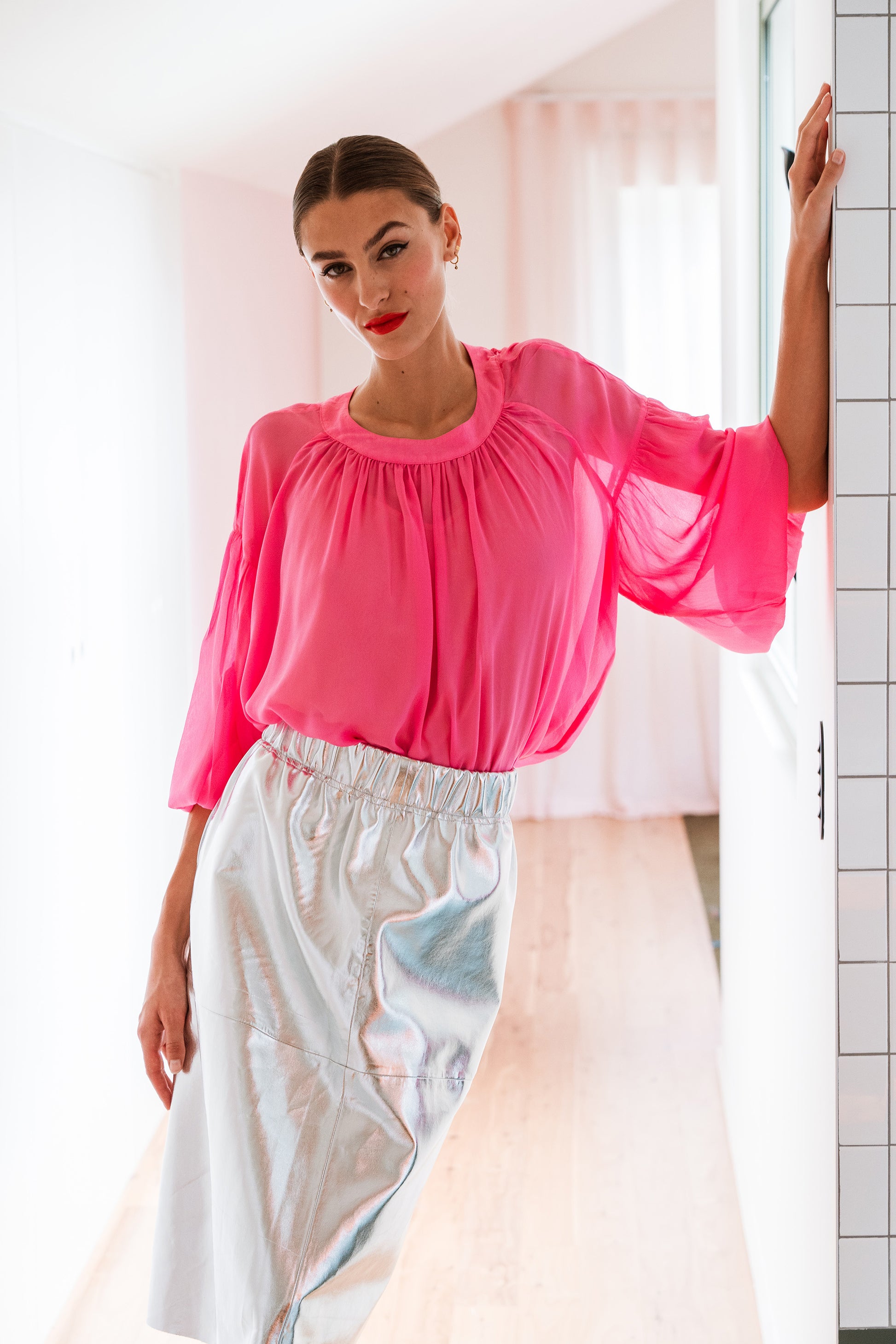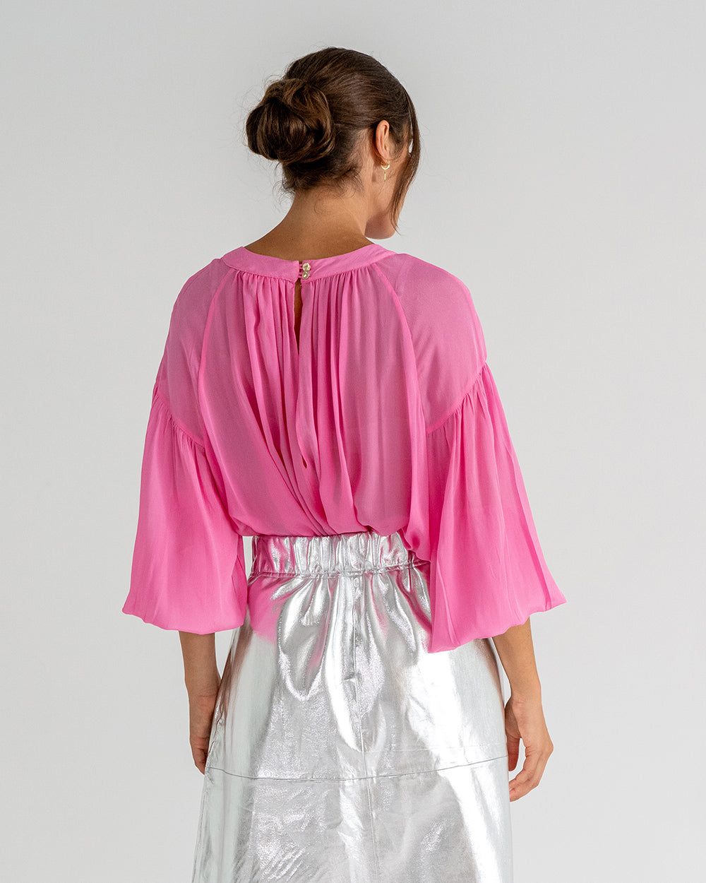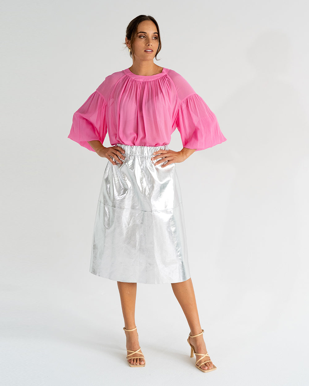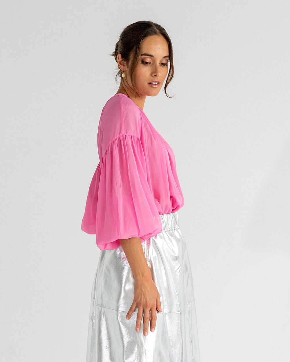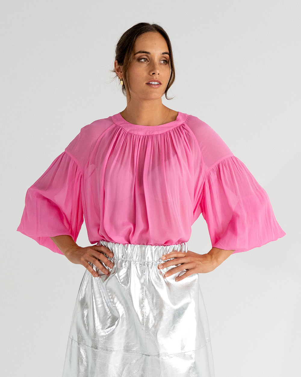 Step into a Spring dream with the Laurent Blouse in Orchid Pink from Arlington Milne. This sheer, lightweight top offers an effortless, breezy look for warmer days. Wear it styled sheer for a bold statement or layer it with a slip underneath for added coverage. Ideal for a birthday celebration paired with the Lexi Silver Skirt or a summer garden wedding matched with the Alba Maxi, the bold colour makes it a standout choice. Crafted from 100% crepe viscose, it features soft balloon sleeves and a scoop neckline with delicate gathering.