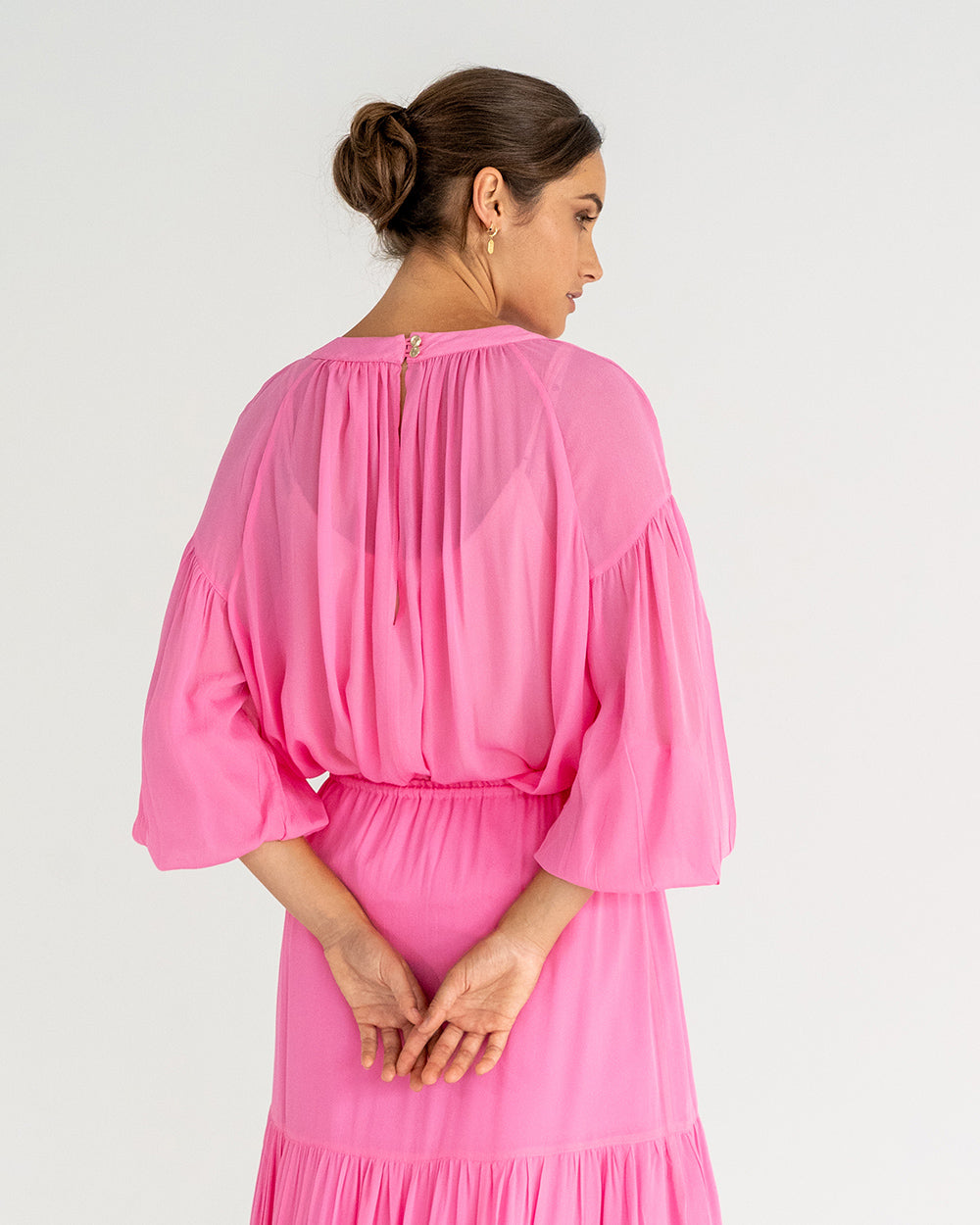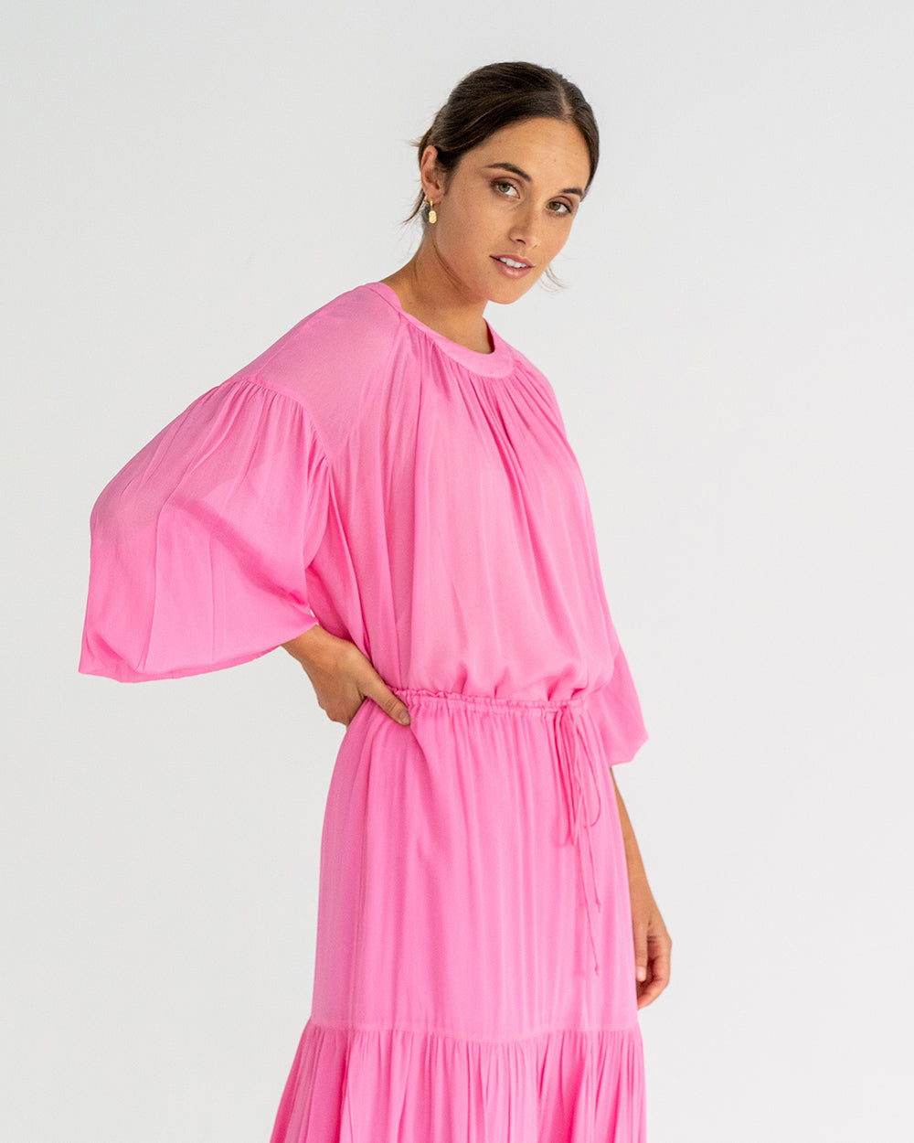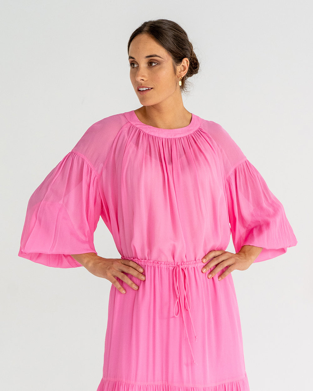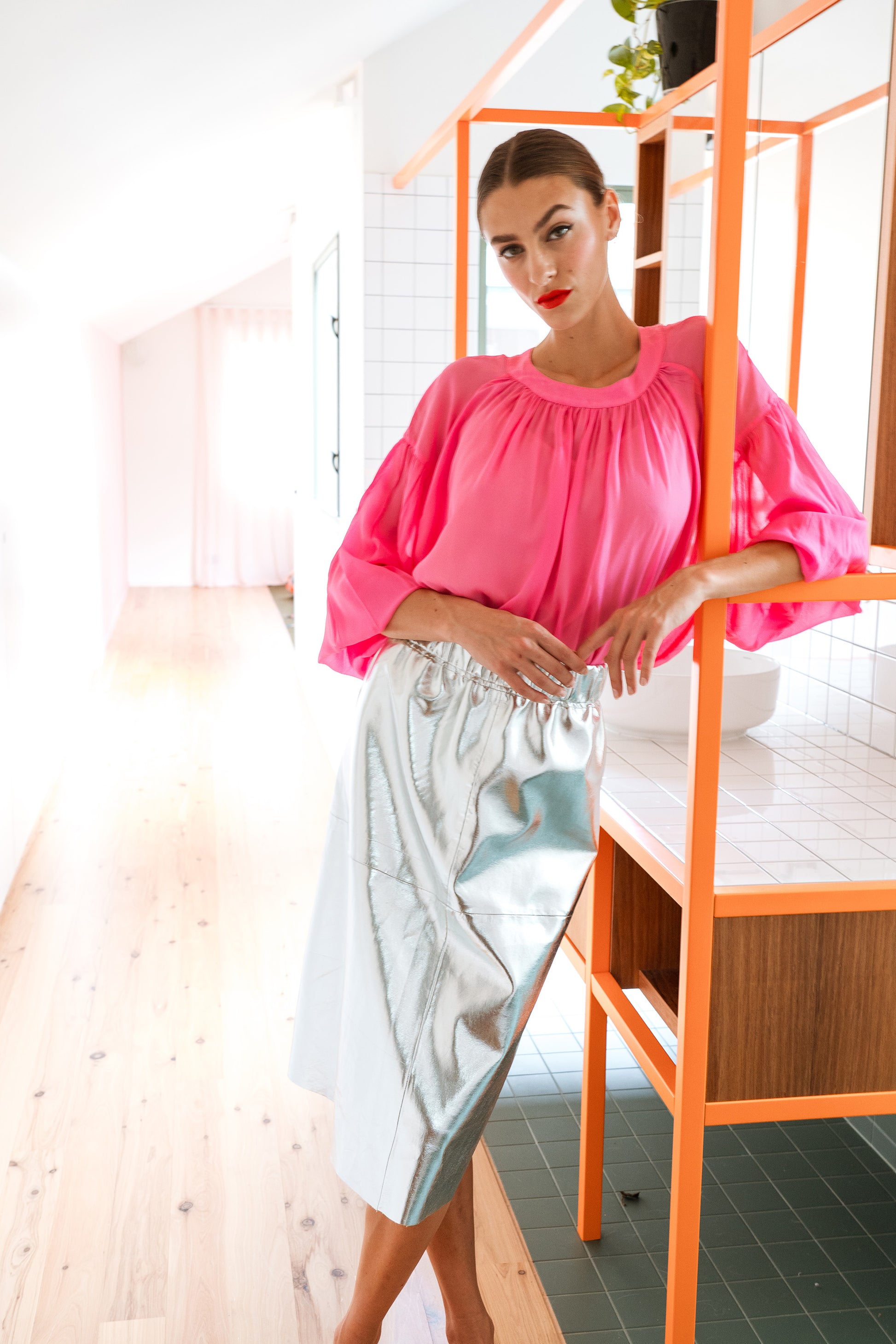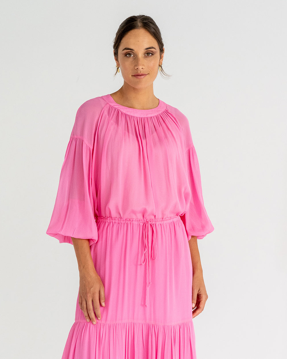 Step into a Spring dream with the Laurent Blouse in Orchid Pink from Arlington Milne. This sheer, lightweight top offers an effortless, breezy look for warmer days. Wear it styled sheer for a bold statement or layer it with a slip underneath for added coverage. Ideal for a birthday celebration paired with the Lexi Silver Skirt or a summer garden wedding matched with the Alba Maxi, the bold colour makes it a standout choice. Crafted from 100% crepe viscose, it features soft balloon sleeves and a scoop neckline with delicate gathering.