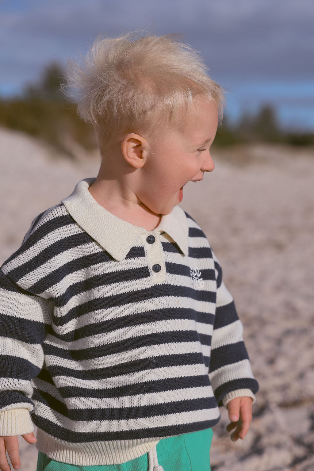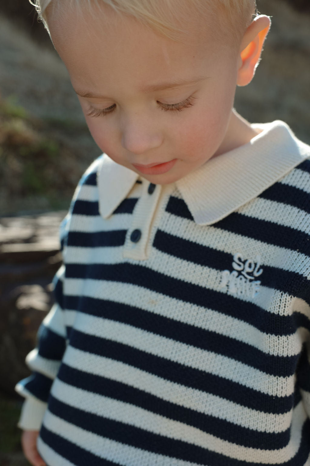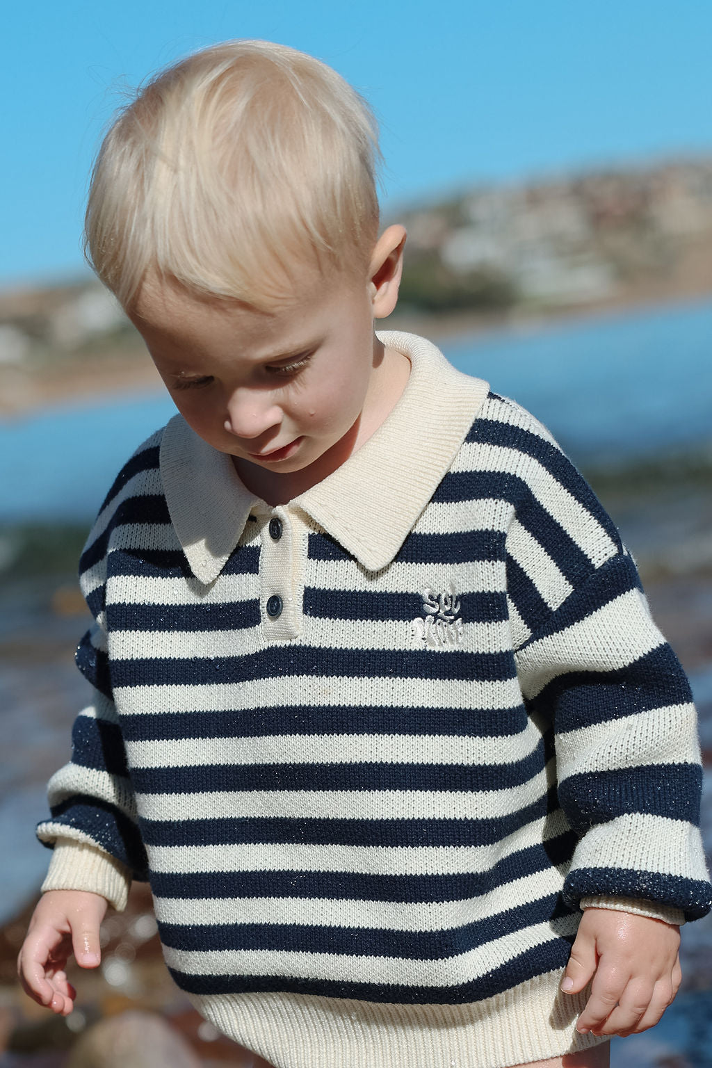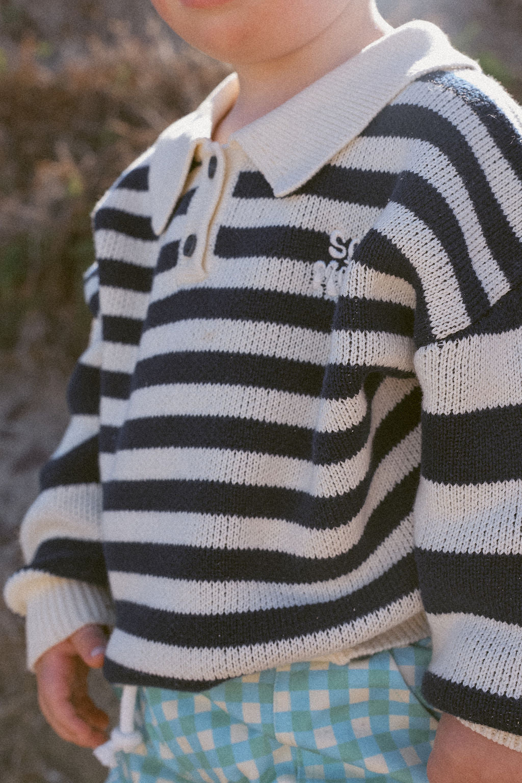 The Kai Knit from Sol Mate is a timeless collared knit featuring navy and creamy white bold stripes on the sleeves and finer stripes across the body. Designed oversized for easy layering, it’s accented with charming navy buttons and their signature “Sol Mate” embroidery. Kai brings a fun, cool vibe that’s both effortless and endlessly stylish.
