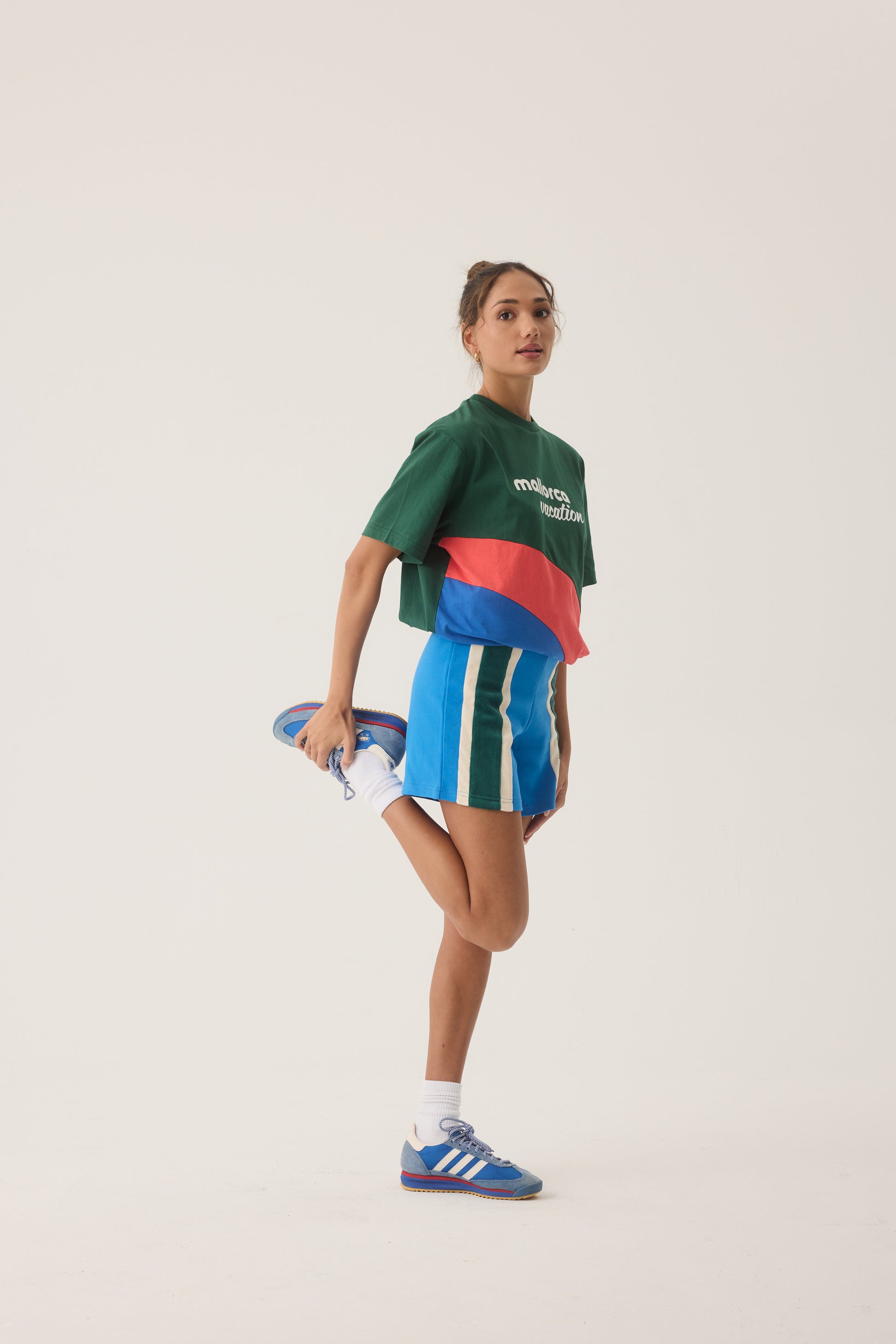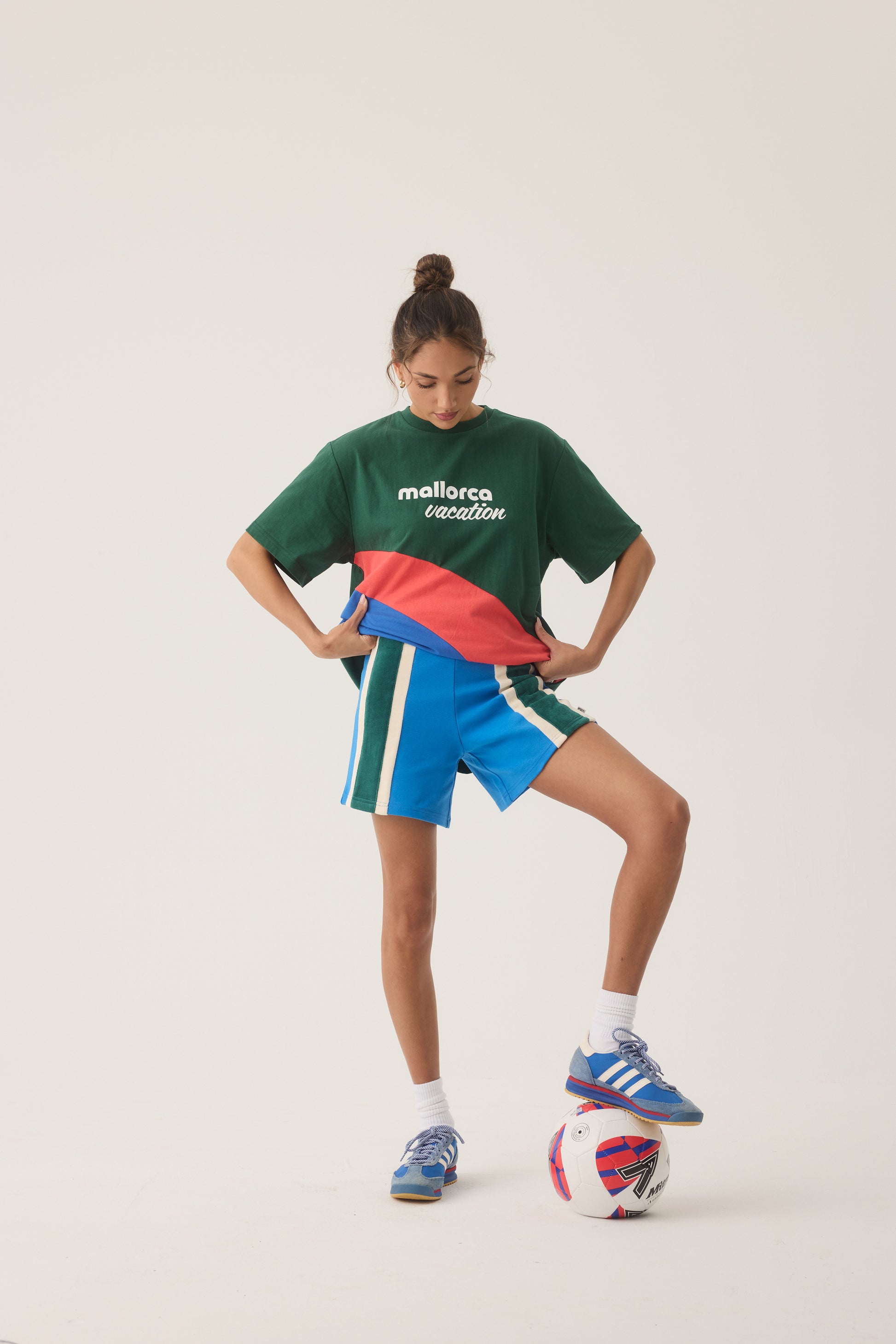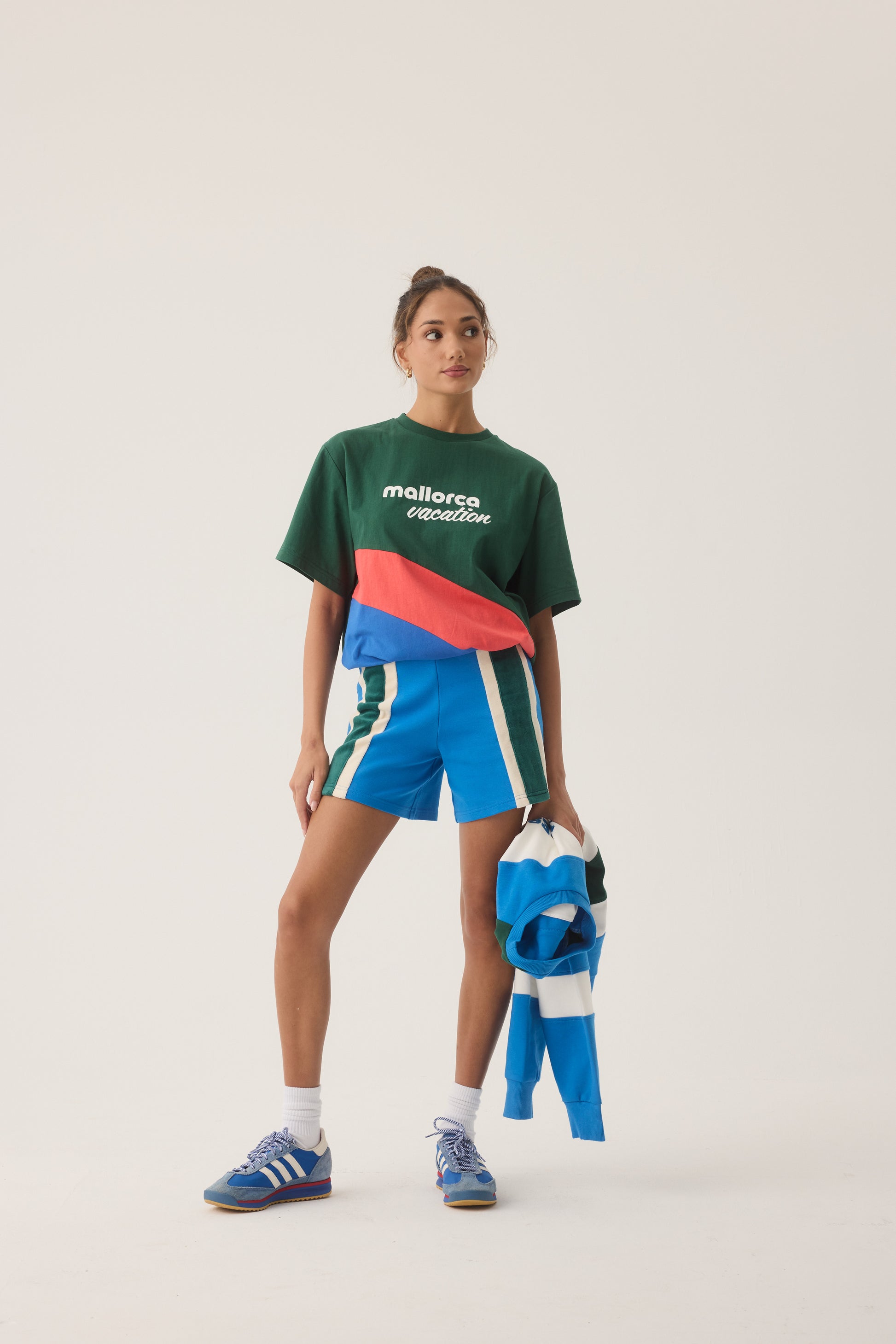 The Palma Short in French Blue brings the fresh feel of bright ocean waves and endless sunny skies right to your wardrobe – ideal for carefree days and laid-back looks. Made from a soft, cozy cotton knit with a comfy elastic waistband, these shorts offer easy, breezy wear. They stand out with a fun contrast velour stripe in green and cream down the front. Team them up withyour favourite oversized tee for a perfect summer look.