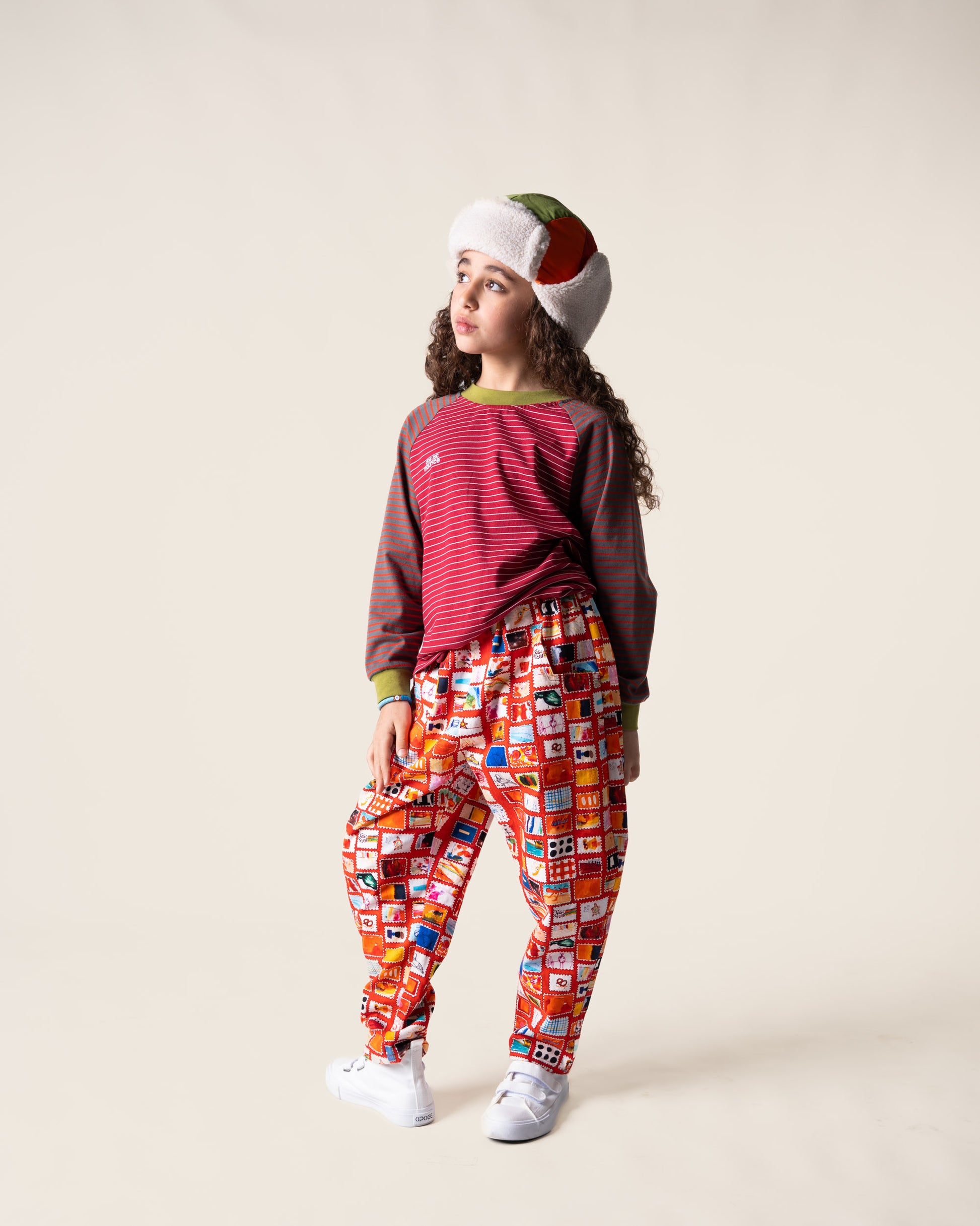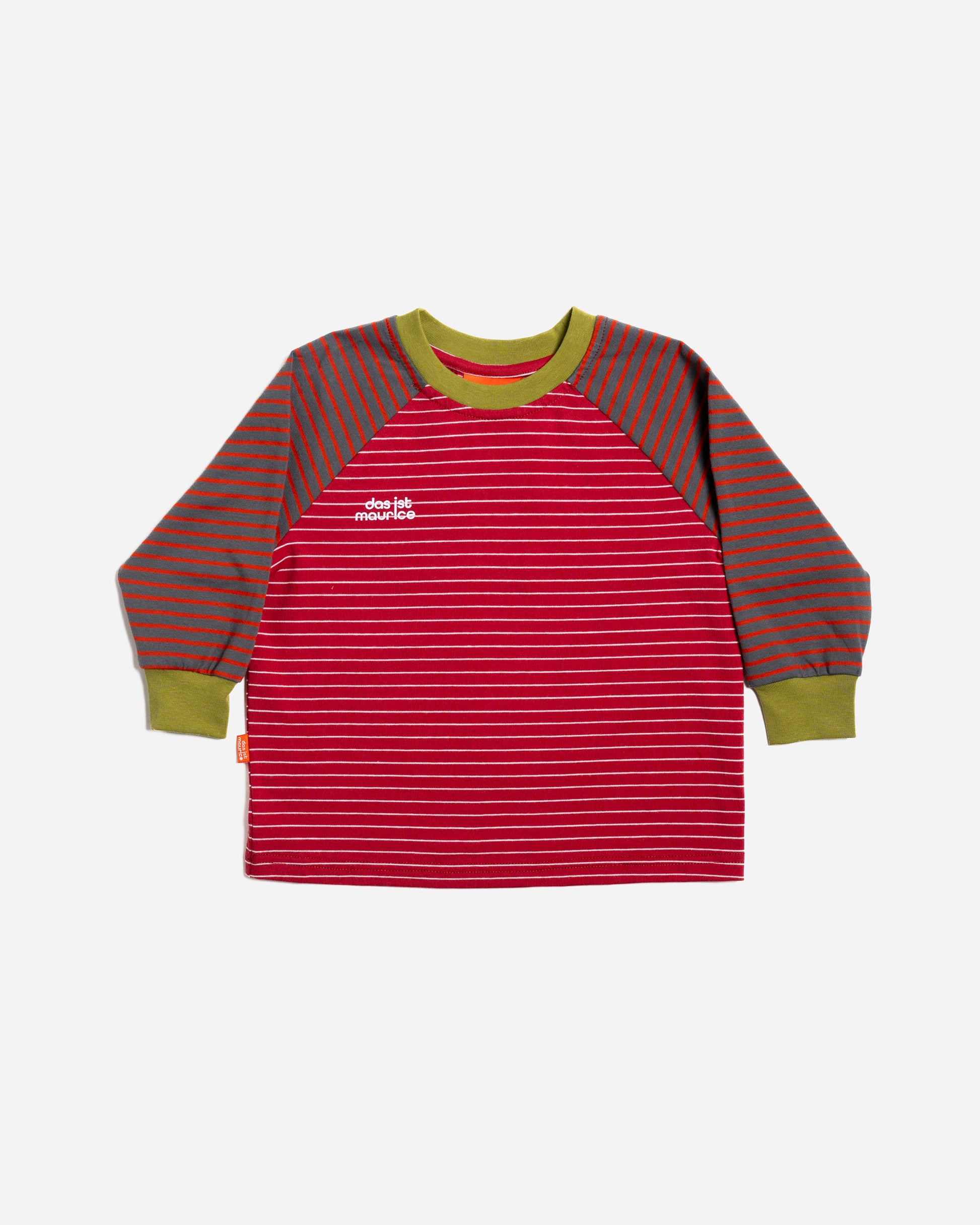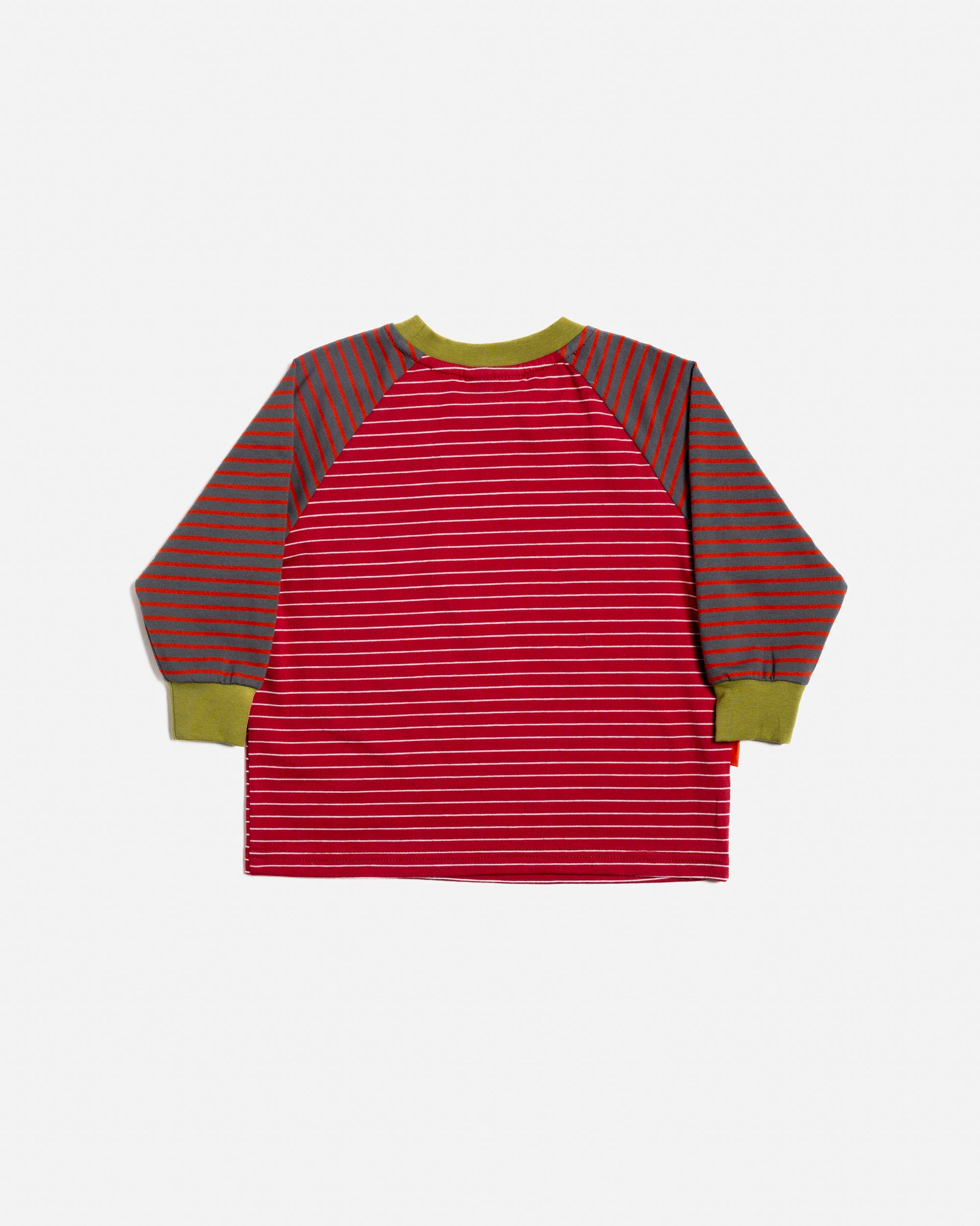 Burgundy striped raglan long sleeve t-shirt crafted from soft organic cotton blend. This playful everyday essential pairs a fine-striped body with contrasting raglan sleeves and ribbed trims for a fun, balanced look. Breathable and comfortable for all-day wear, the relaxed fit makes layering effortless across any season. Perfect for adding personality to your little ones casual wardrobe while staying cosy and versatile.