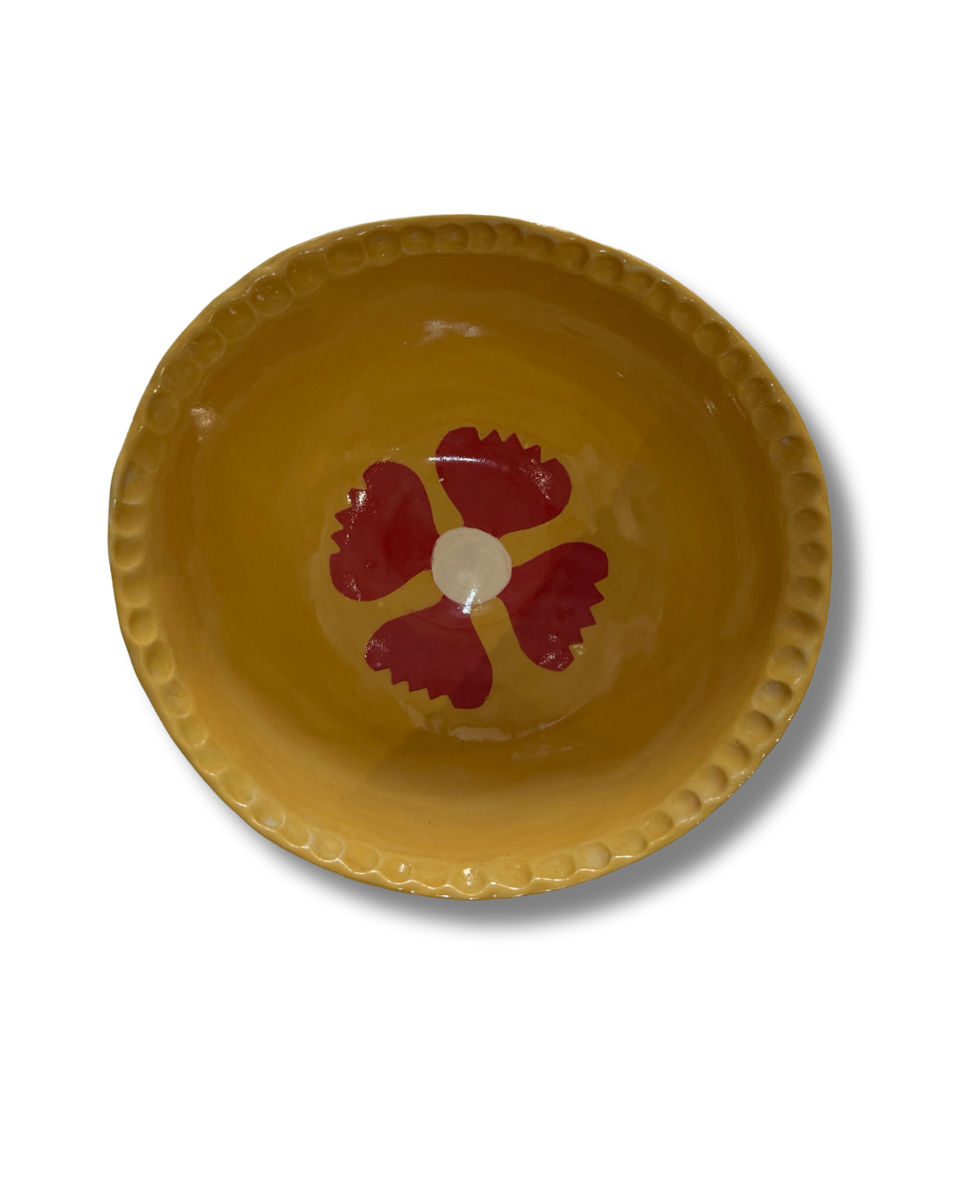Stunning handmade large mixing bowl with flower motif in the centre and semicircle on the sides.