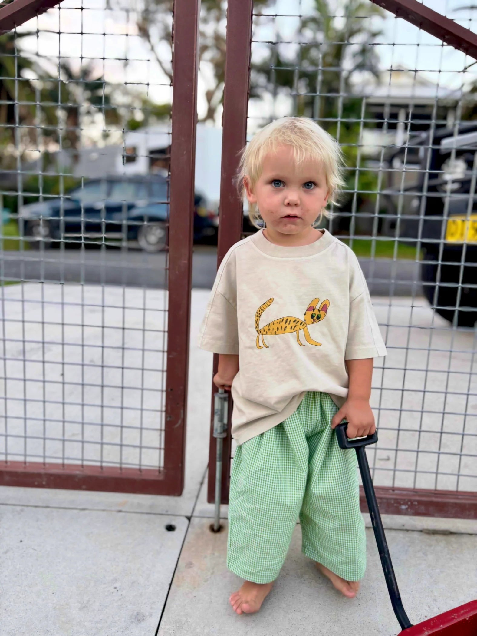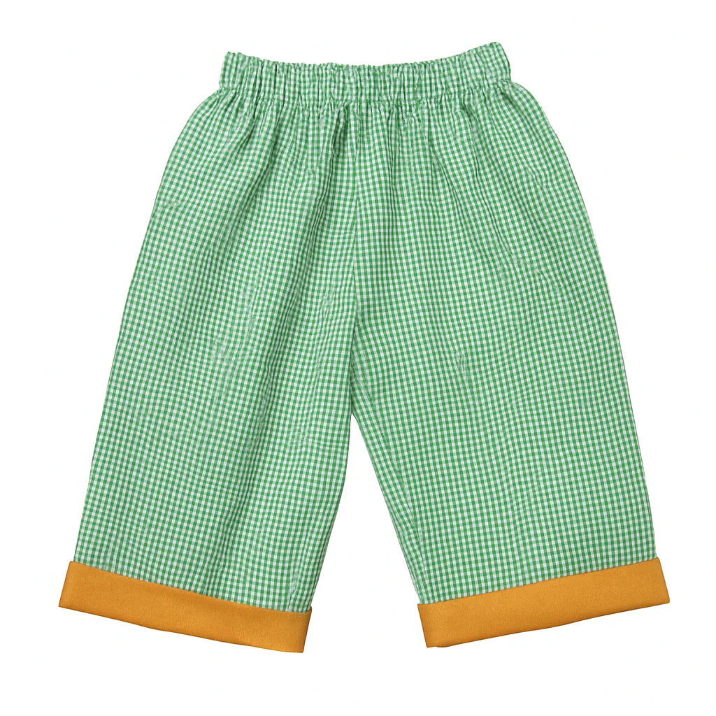 These playful, oversized kids' pants in bright green gingham are designed with both fun and function in mind. Inspired by Trolli Sour Lolly Snakes, the vibrant orange lining offers a delightful surprise when the cuffs are rolled—adding a bold splash of colour. Cut true-to-size with an intentionally roomy fit, they allow for comfort, growth, and plenty of movement. Perfect for everyday adventures, with a quirky twist that kids (and their grown-ups) will adore.