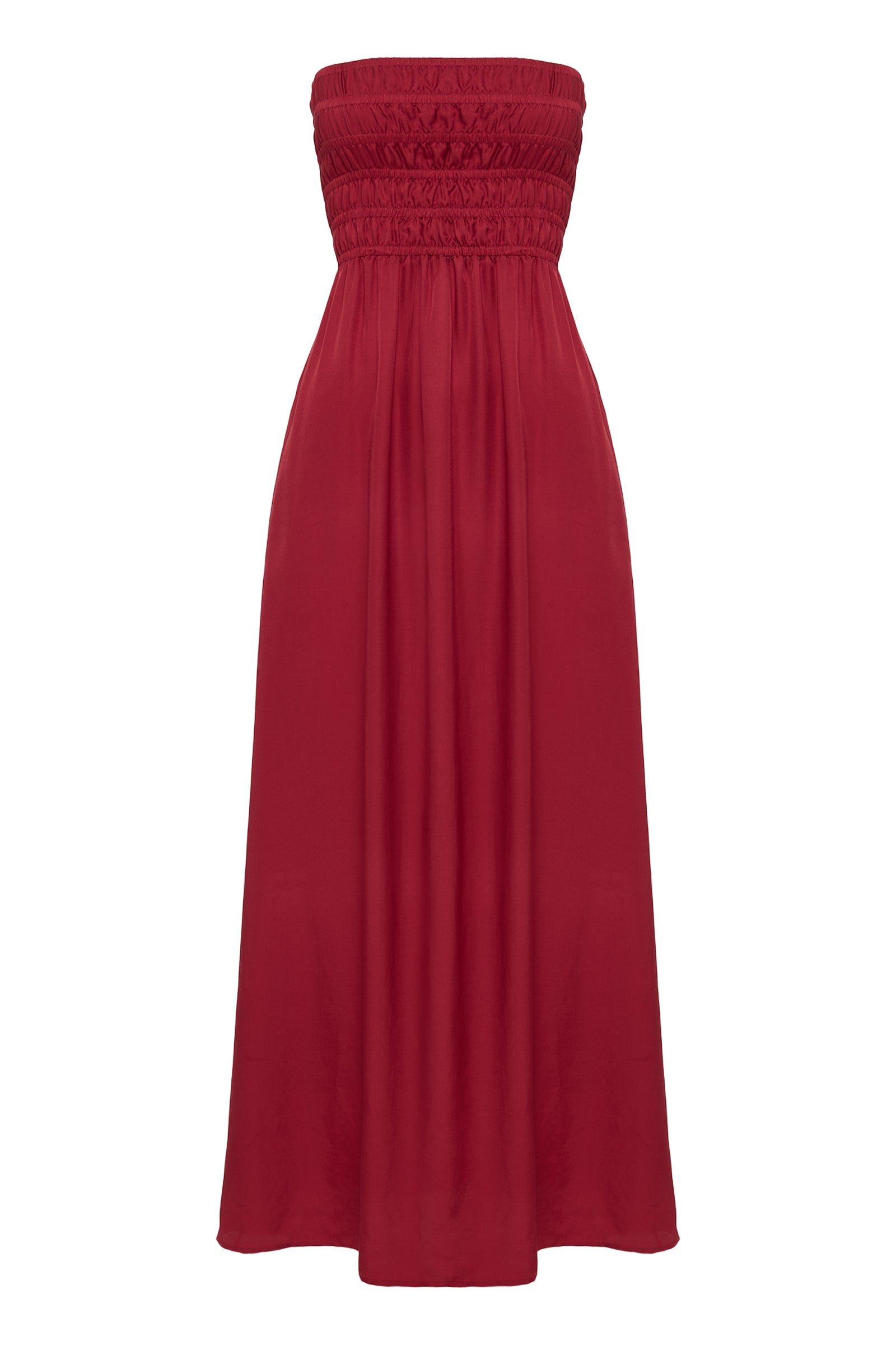 Slip into effortless elegance with the Zuri dress from Nude Lucy in striking crimson. This showstopper features a luxurious Tencel blend that's feather-light and beautifully fluid against your skin. The strapless bodice hugs you with gentle shirring while the airy skirt flows freely, hitting just above the ankle. Practical side pockets and cheeky hem splits add movement and function to this beloved silhouette that's equal parts romantic and relaxed.